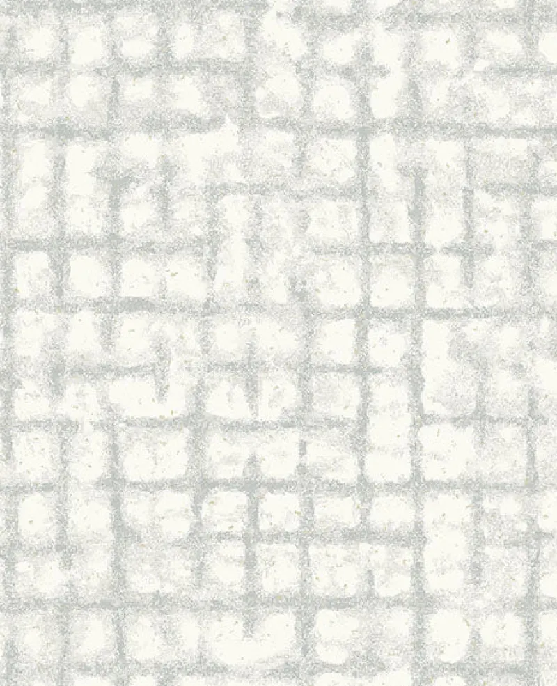 Add dimension to walls with this abstract geometric wallpaper. The silver pattern shimmers with raised inks against an off-white distressed backdrop. Shea is an unpasted, non-woven wallpaper.
