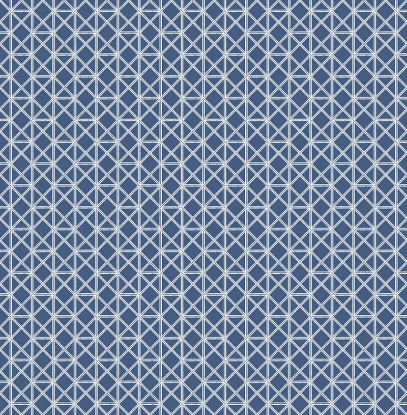 Thin white rods are woven together across a cool blue backdrop, forming an intricate pattern of squares and triangles. This wallpaper is a perfect accent for coastal designs. Lisbeth is an unpasted, non woven wallpaper.