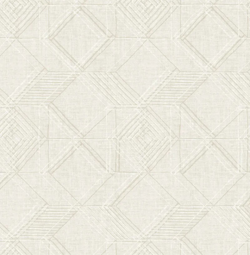 Warm neutrals are elevated with dimensional details in this contemporary geometric wallpaper. Intricate lattice work – drawn in raised inks first in white and again in khaki – provide a tactile, 3D effect. An off-white, faux linen background adds an additional layer of subtle embellishment. Moki is an unpasted, non woven wallpaper.