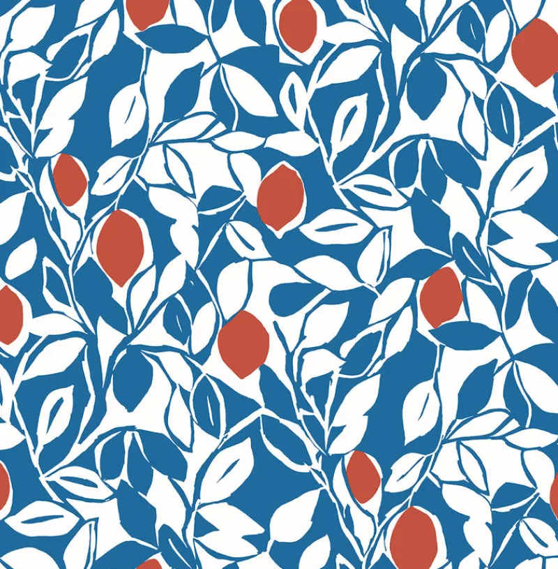 A twist of a classic theme, this eclectic fruit wallpaper will add a bright splash of character to your space. Red citrus hangs from branches shaped by the interplay of bright blue color blocking and white negative space. Loretto is an unpasted, non woven wallpaper.