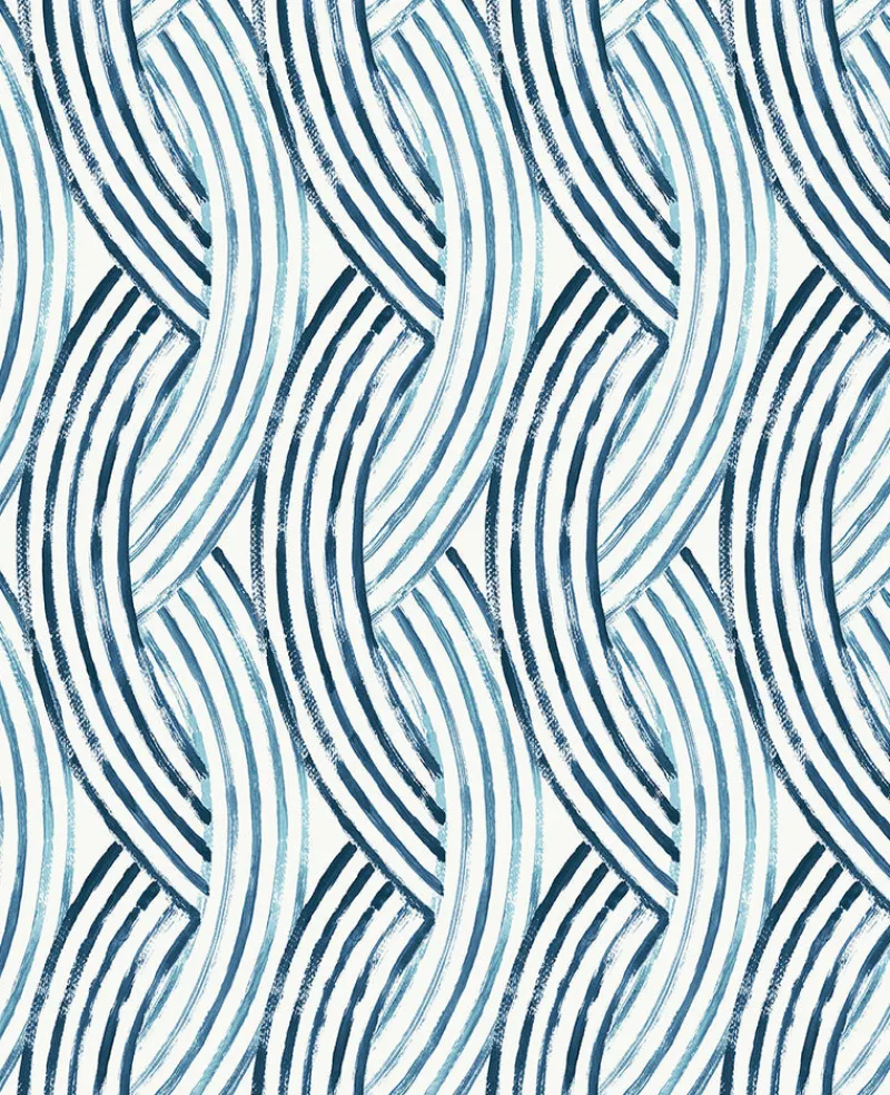 This abstract design invokes the ocean tides with its broad, blue arches. Light and dark blue groupings weave together against a white background, the patchiness of each stroke giving the sense of being painted.