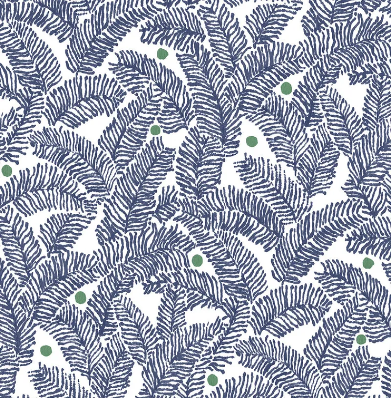 Groups of navy colored ferns sway across a white backdrop and are accented by sporadic green dots in this Scandinavian-inspired botanical. Athina is an unpasted, non woven wallpaper.