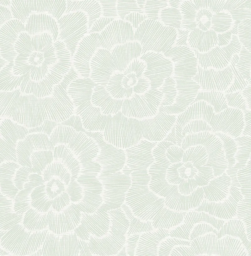 This tranquil floral wallpaper features artistic blooms composed of dashes of minty green raised ink. A light grey grasscloth patterned backdrop adds subtle dimension. Periwinkle is an unpasted, non woven wallpaper.