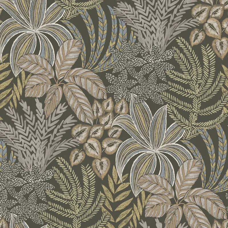 Bring fresh life to your interiors with this botanical design. An array of flourishing ferns and leafy plants are artistically rendered in muted browns, blues, greens and greys against a dark brown backdrop. Sumner is an unpasted, non woven wallpaper.