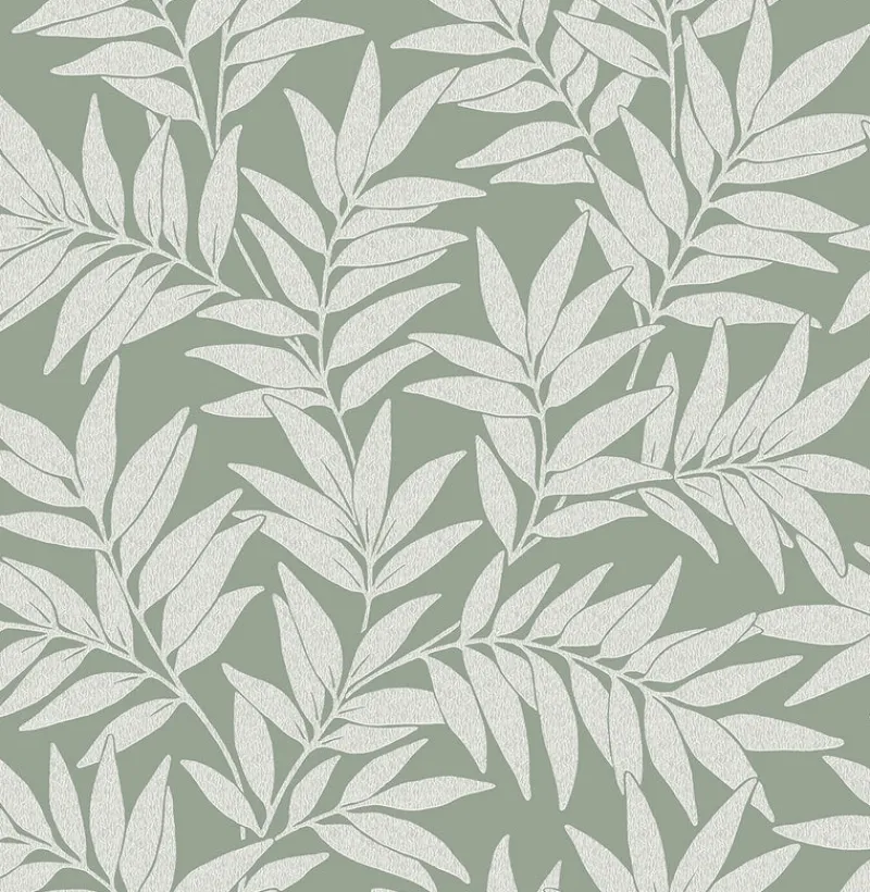This elegant botanical design will fill your home with earthen serenity. The light grey ferns, accented with raised inks, sway against a soothing green backdrop. Morris is an unpasted, non woven wallpaper.