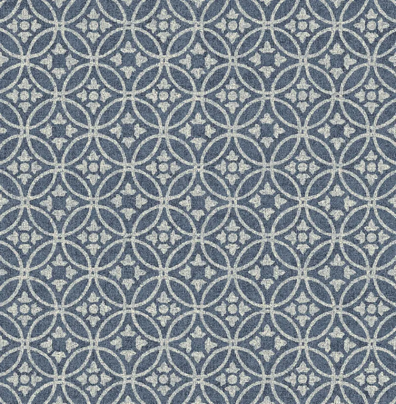 Add charming craftsman styling to your home with this geometric wallpaper! The rich navy background is stamped with a grid of white, overlapping circles accented with a simple floral embellishment. Larsson is an unpasted, non woven wallpaper.