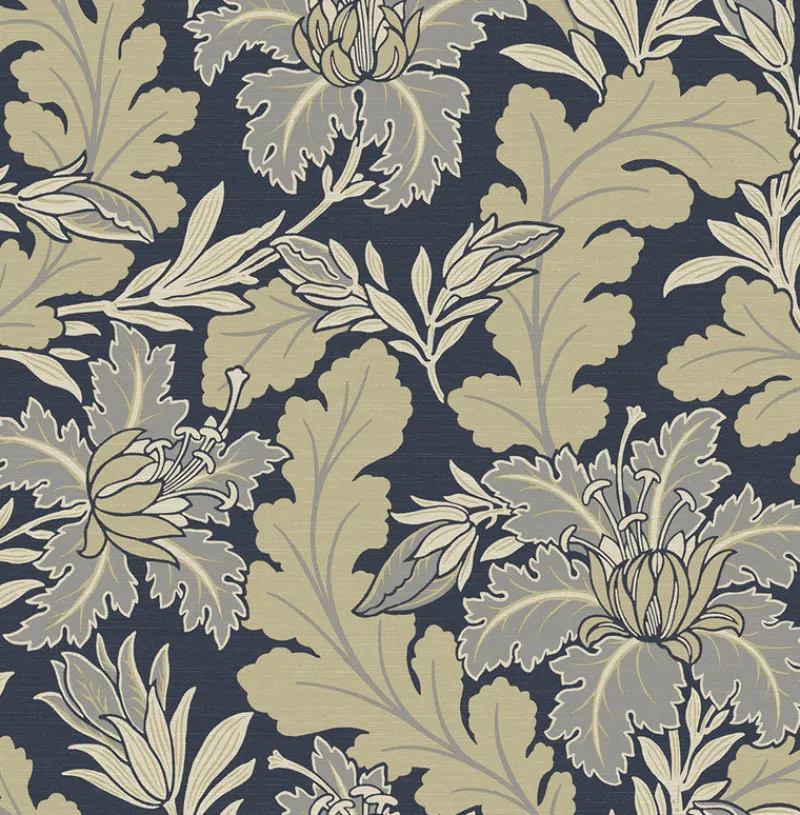 Add elegance and rich character to your interiors with this gorgeous floral wallpaper. The large-scale design features embellished flowers framed by long, scalloped leaves in a coolly contrasting, navy and muted yellow palette. Butterfield is an unpasted, non woven wallpaper.