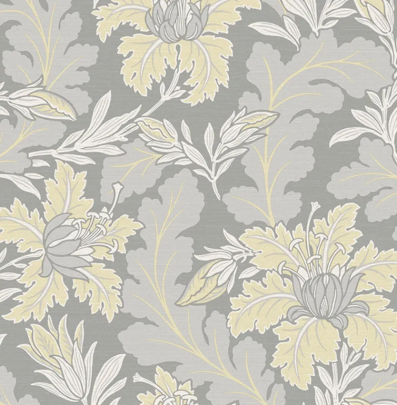 The Art and Crafts stylings of this ornamental floral design brings iconic character to your walls. The elaborate, pale yellow blooms are framed by long, scalloped grey leaves against a darker grey backdrop. Butterfield is an unpasted, non woven wallpaper.
