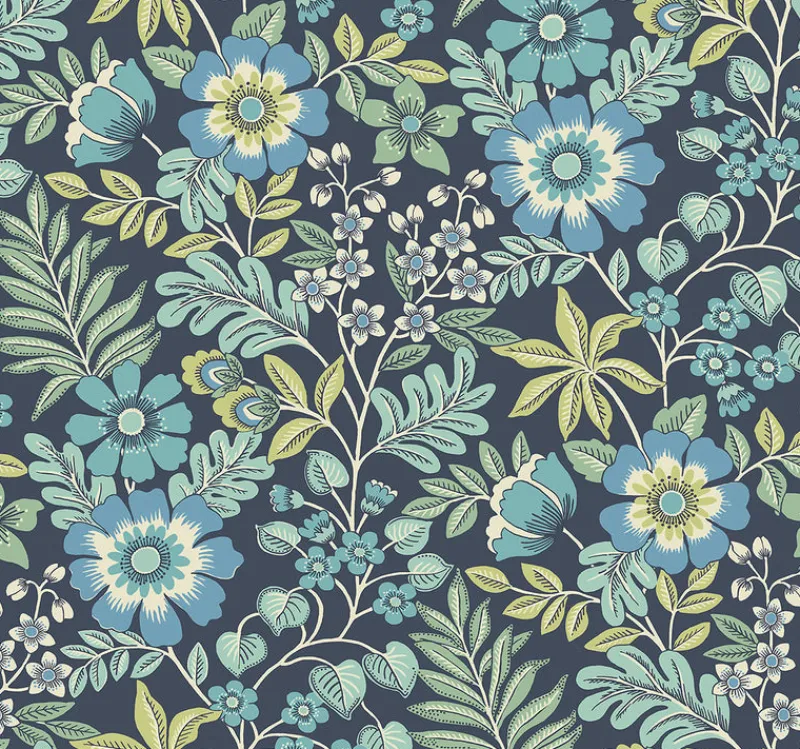 Bring retro-inspired charm to your walls with this sweet floral design. The simple illustrative styling of the flowers and leaves is complimented by a color palette of soft blues and greens on navy. Voysey is an unpasted, non woven wallpaper.