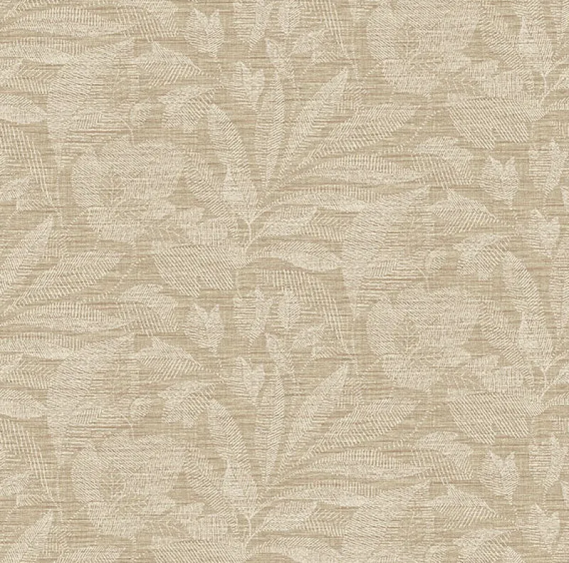 Bring warmth and dimension to your walls with this modern botanical design. Leaves are shaped by dashes of white ink and cover a variegated golden beige faux-fabric backdrop. Lei is an unpasted, non woven fabric backed vinyl wallpaper.