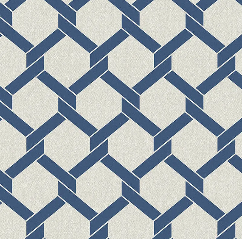 Enjoy a modern update to the classic trellis design with this wallpaper! Blue hexagon framing, with a sharp twist where each shape joins, gives this design contemporary appeal. Raised ink detailing throughout provides additional dimension. Payton is an unpasted, non woven fabric backed vinyl wallpaper.