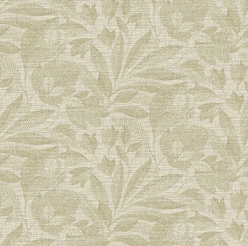 Ground your home with the earthen ambiance of this elegant botanical wallpaper. Leaves shaped by lines of metallic gold sit against a variegated beige backdrop that looks like linen. Lei is an unpasted, vinyl wallpaper.