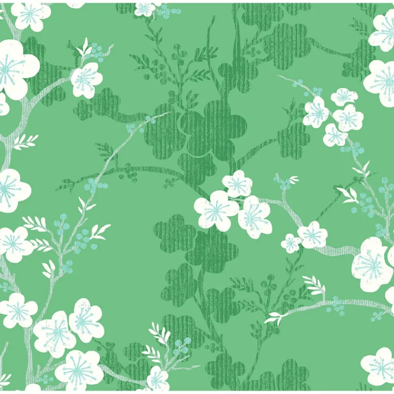 Add the cheerful freshness of a new spring day to your home with this gorgeous floral wallpaper. The modern chinoiserie design features winding branches dotted with white blossoms, shadowed by dark green banch silhouettes against a lighter green backdrop. Nicolette is an unpasted, acrylic coated wallpaper.