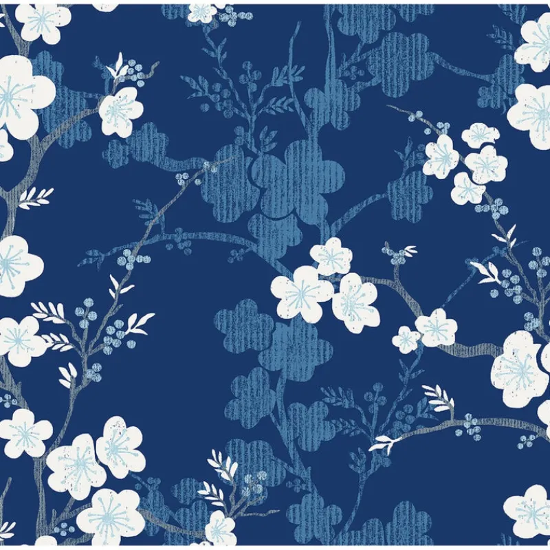 Add modern chinoiserie flair to your walls with this gorgeous floral design! Winding branches dotted with white blossoms are shadowed by blue silhouettes, all set against a rich blue backdrop. Nicolette is an unpasted, acrylic coated wallpaper.