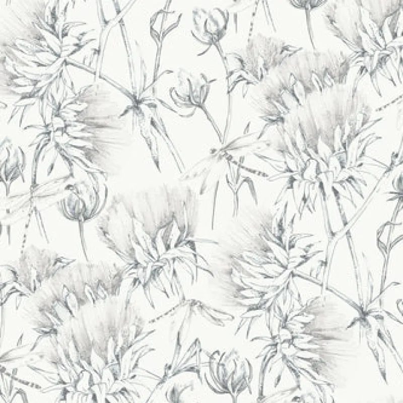 Enjoy summertime serenity year-round with this delightful botanical wallpaper. Dragonflies flutter around feathery flowers, the entire design illustrated in an array of grey inks against a white backdrop. Mariell is an unpasted, acrylic coated wallpaper.
