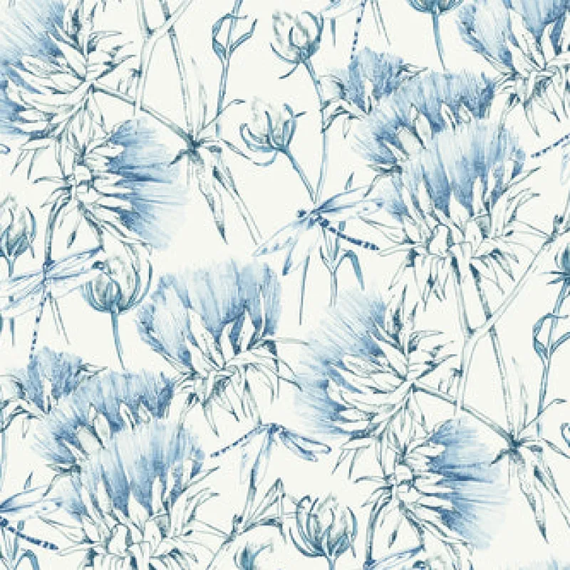 Enjoy the peaceful ambiance of summer anytime with this soothing botanical wallpaper. Dragonflies flutter around feathery flowers, the illustrative design inked in shades of blue on white. Mariell is an unpasted, acrylic coated wallpaper.