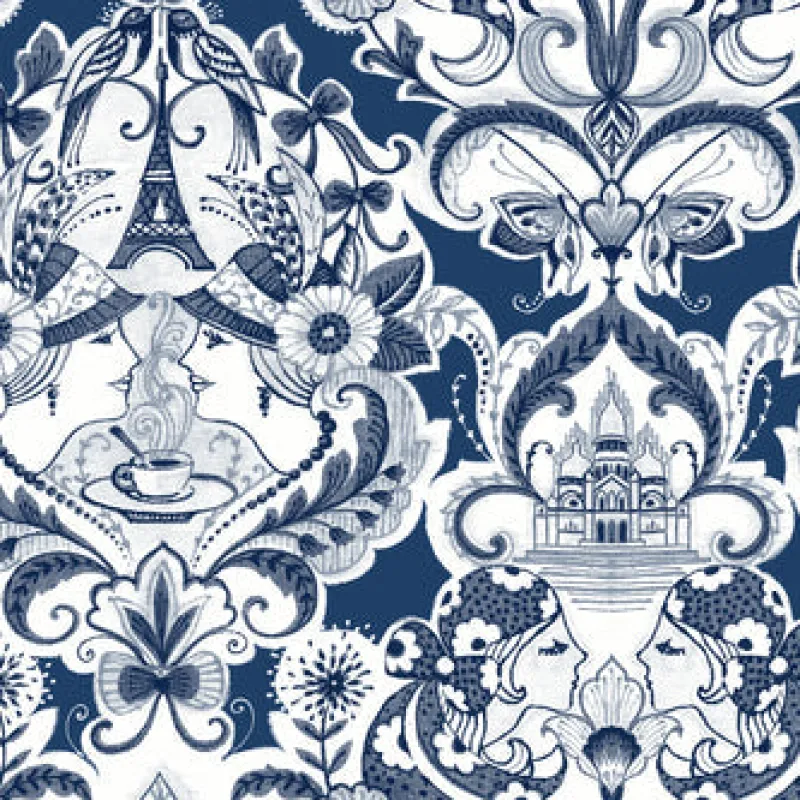 Indulge in a leisurely and high-fashion Parisian moment with this stunning damask wallpaper. A charming illustration of two women at a café by the Eiffel Tower is drawn in blue against a deep lapis blue backdrop. Sadie is an unpasted, acrylic coated wallpaper.