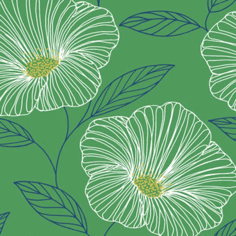 Bold colors and airy detailing combine in this cheerful floral wallpaper. The large flowers are shaped from flowing white lines, the centers accented with metallic gold dots. A simple blue stem connects each bloom along a green backdrop. Mythic is an unpasted, acrylic coated wallpaper.