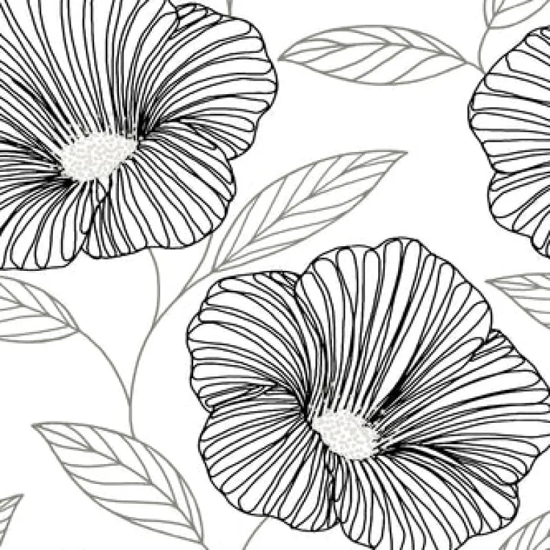 Bring bold but airy style to your space with this modern floral wallpaper. The large-scale blooms are shaped from bold black lines against a soft white backdrop, the center of the flowers accented with metallic silver dots. Mythic is an unpasted, acrylic coated wallpaper.