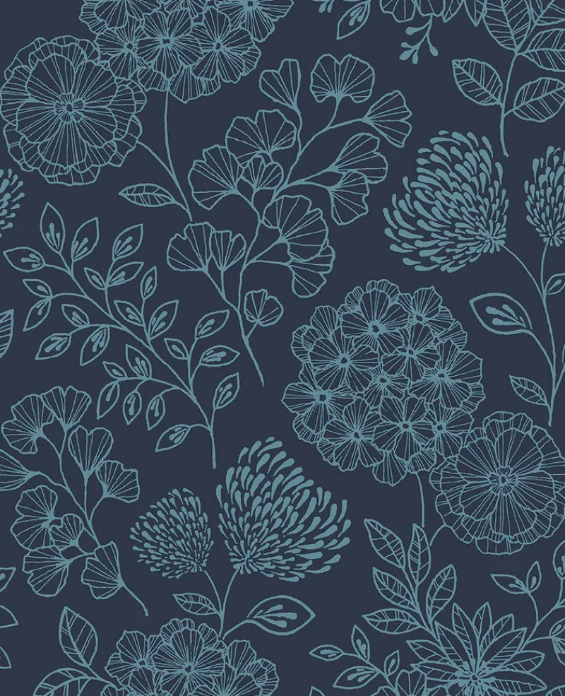 Delicate floral details and rich color bring modern charm to your home. The crisp linework against the deep blue backdrop creates a simple elegance. Ada is an unpasted, non woven wallpaper.