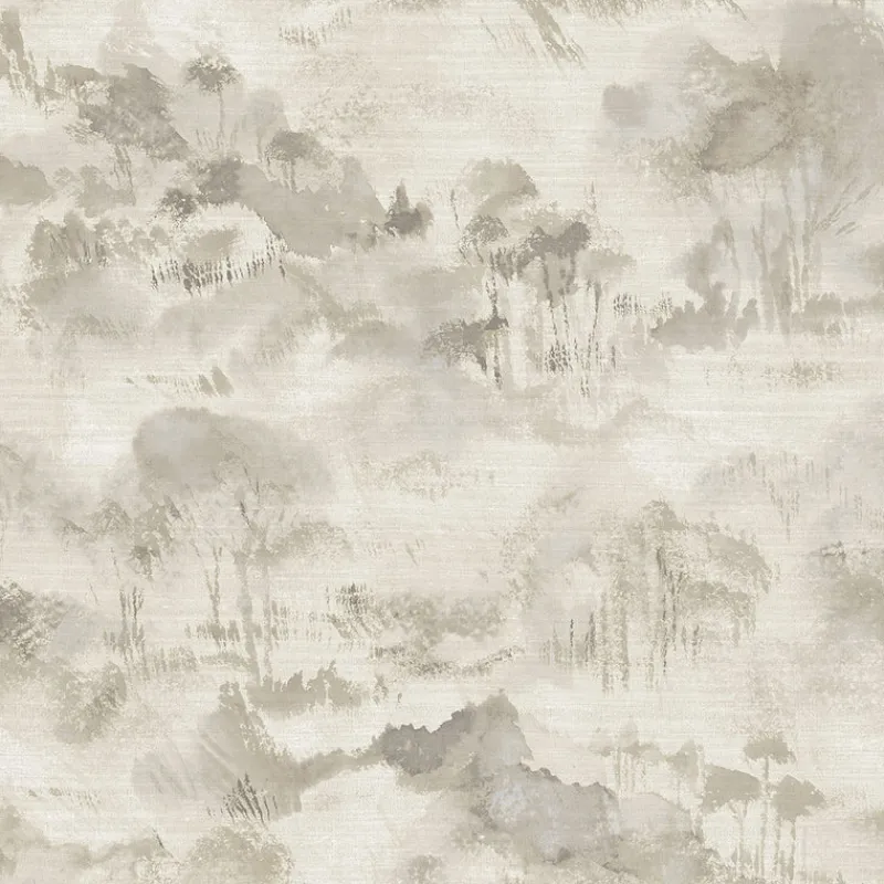 Classic elegance meets updated styling in this contemporary take on toile design. A neutral palette reveals an abstract landscape of tree-lined hilltops. Nara is an unpasted, non woven wallpaper.