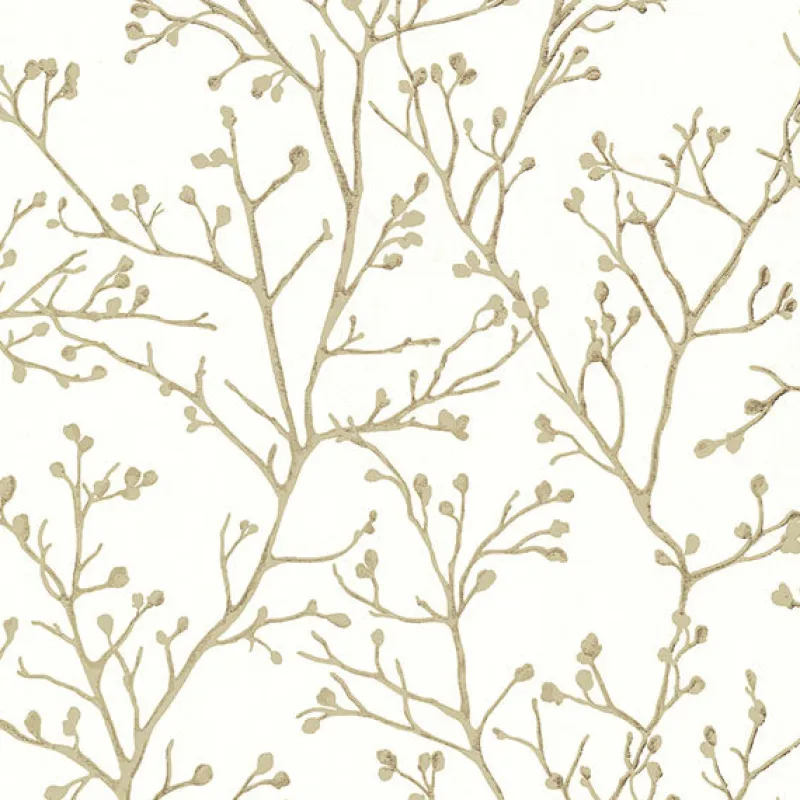 This simple botanical wallpaper brings graceful elegance to your home. Bright golden branches with metallic detailing rest against a creamy white backdrop. Koura is an unpasted, foil on non woven wallpaper.