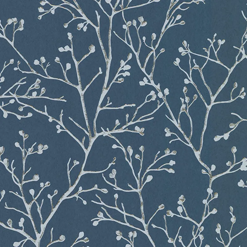 Add classical elegance to your interiors with this delicate botanical design. Spindly silver branches sport delicate buds and metallic accenting against a rich sapphire blue backdrop. Koura is an unpasted, foil on non woven wallpaper.