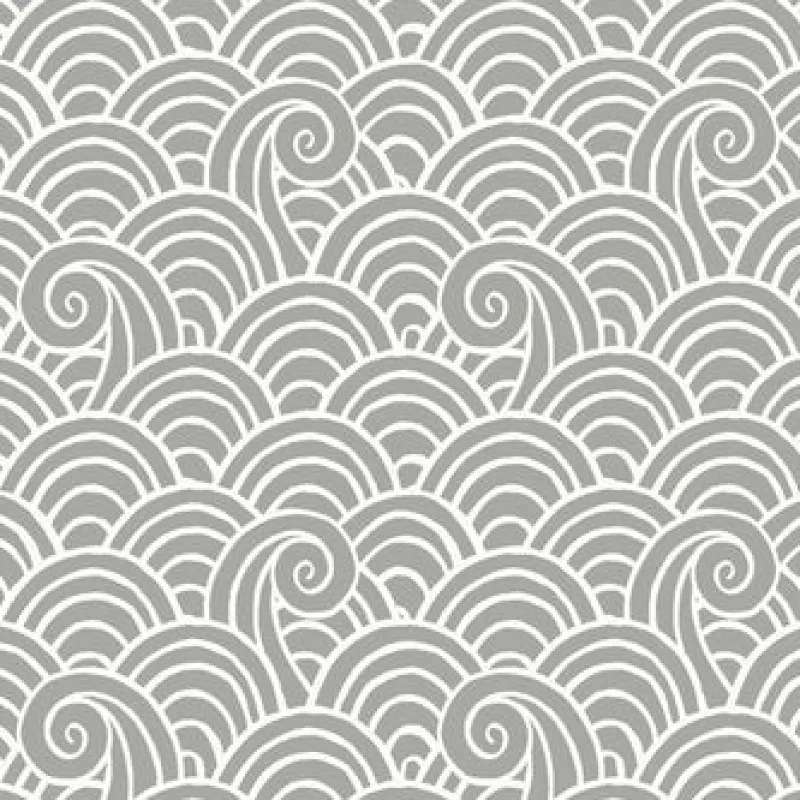 This wave wallpaper is a playful and modern update to a classic design theme! The grey ocean swells are shaped by thick white lines that exaggerate the motion of the ocean. Alorah is an unpasted, non woven wallpaper.