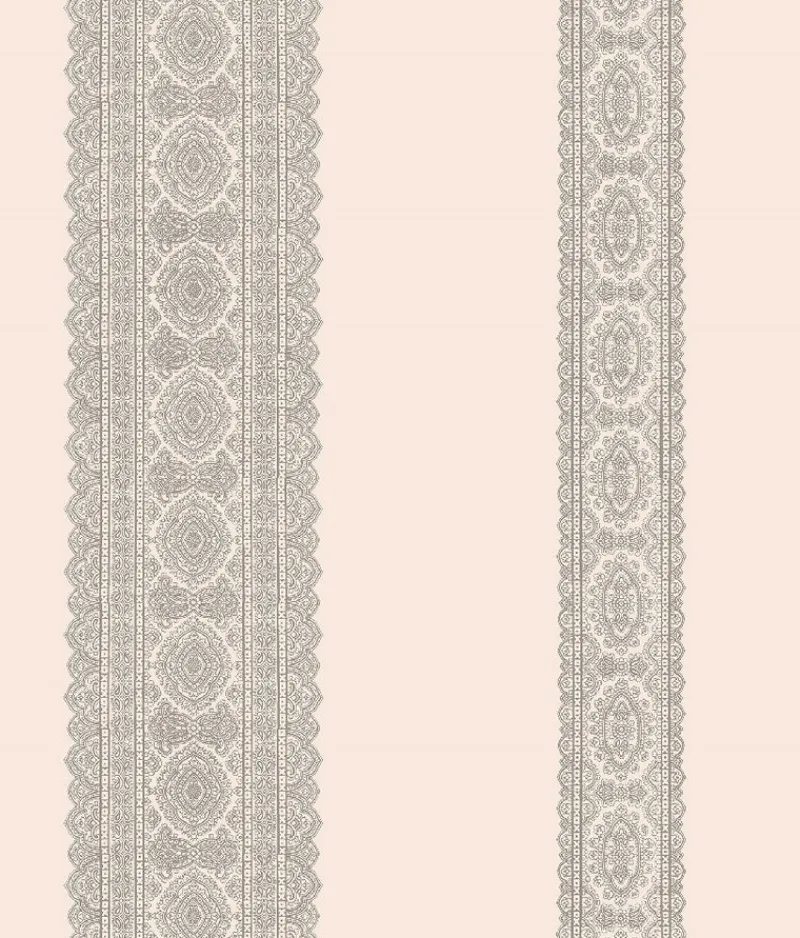 A soft pale pink and silver grey make a romantic pairing on this paisley wallpaper. Decorated in beautiful boteh motifs, medallions and mehndi style details, this ornate stripe brings a sophisticated look to your space backed by a fresh exotic allure.