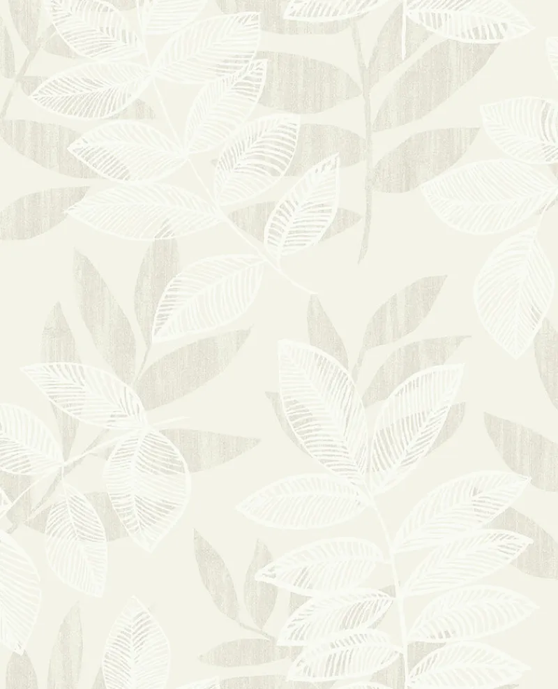 One large-scale leaf prints dance across another in dimensional white flocking. Mica flecks give the champagne background a metallic glow for a boho-glam twist. Chimera is an unpasted, non woven wallpaper.