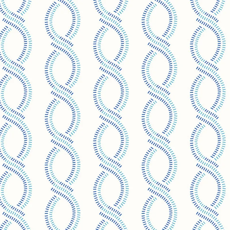 Little navy blue and turquoise strie make up larger weaving stripes that look like figure eights for this simple ornamental stripe print to create a fun contemporary wallpaper.