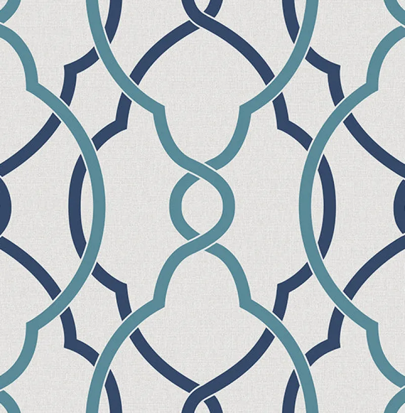 Turquoise and navy blue lattice curve and weave through this neutral taupe wallpaper.