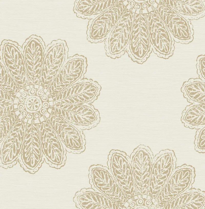 Fresh and bohemian, this medallion wallpaper feels welcoming in light brown and beige. Printed with raised ink over a pearlescent background to give the look of grasscloth. Sol is an unpasted, non woven wallpaper.