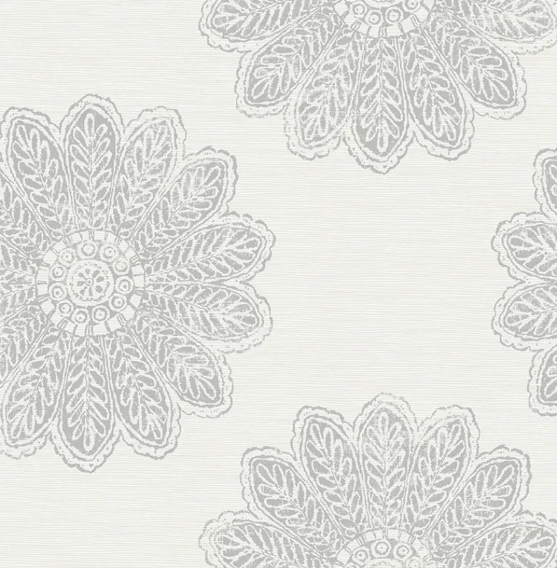 Large-scale medallions are printed in grey over a dove background that shines silver in the light. Raised ink accents replicate the feel and look of grasscloth. Sol is an unpasted, non woven wallpaper.