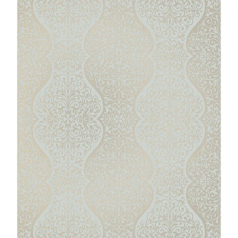 Add this intricate scroll wallpaper to your décor for an elegant finish. A mixture of matte and metallic inks and a hint of blue make this stunning design come to life.