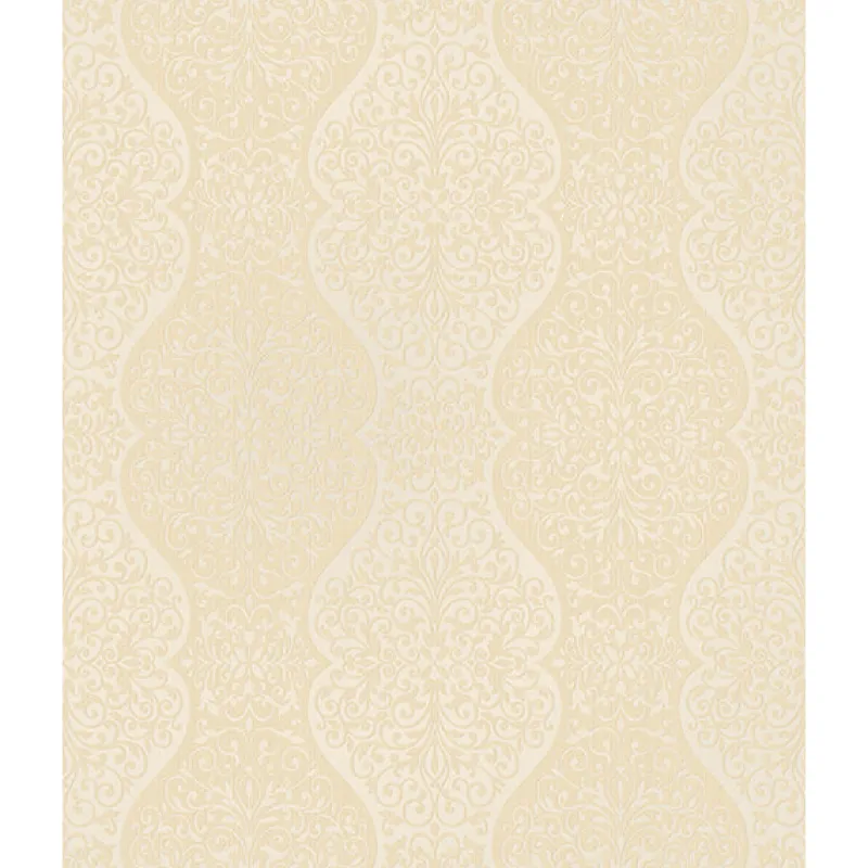 Intricate scroll work and classic stripes make a stunning wallpaper. This muted gold design becomes an elegant neutral with a textured effect for added dimension.