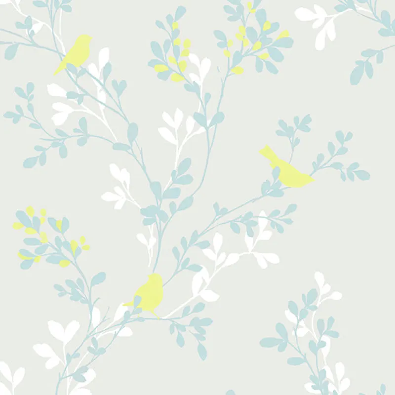 A bright and modern color palette accompanies a whimsical pattern. Chartreuse birds perch amongst matte grey and soft blue branches. The wallpaper’s background shines in metallic silver.