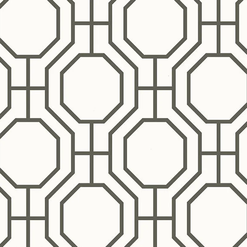 An octangonal trellis pattern is a clean look for walls. The simple but elegant black and ivory color scheme will brighten a room. This stylish wallpaper will complement many decor styles.