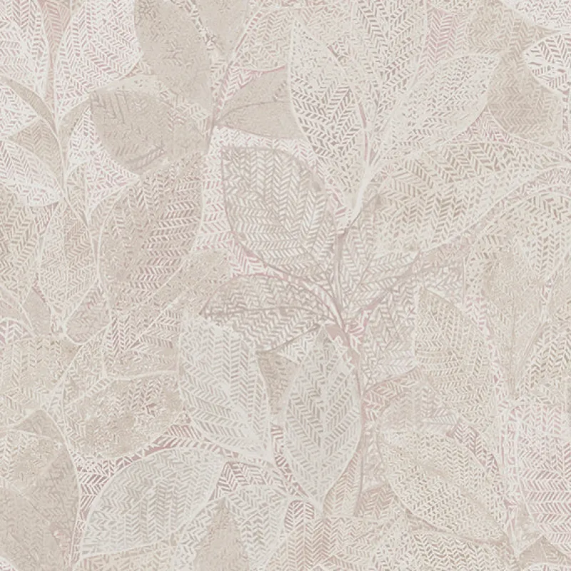 Overlapping leaves give this wallpaper pattern an abstract feel. The botanical print is modernized with metallic platinum and blush inks. Rich in texture and print, this wallpaper would be a beautiful addition to any home.