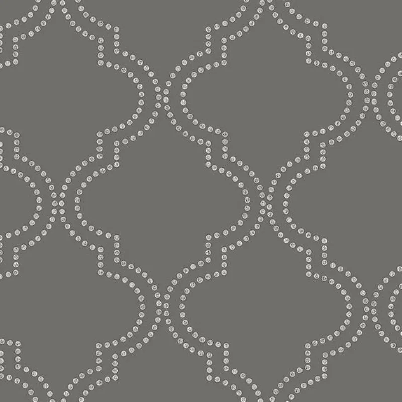 Rich charcoal and silver foil meld together to create a wallpaper that captivates the viewer. The metallic quatrefoil design is comprised of textured dots for a fun play on a classic. This modern pattern will glide over walls.