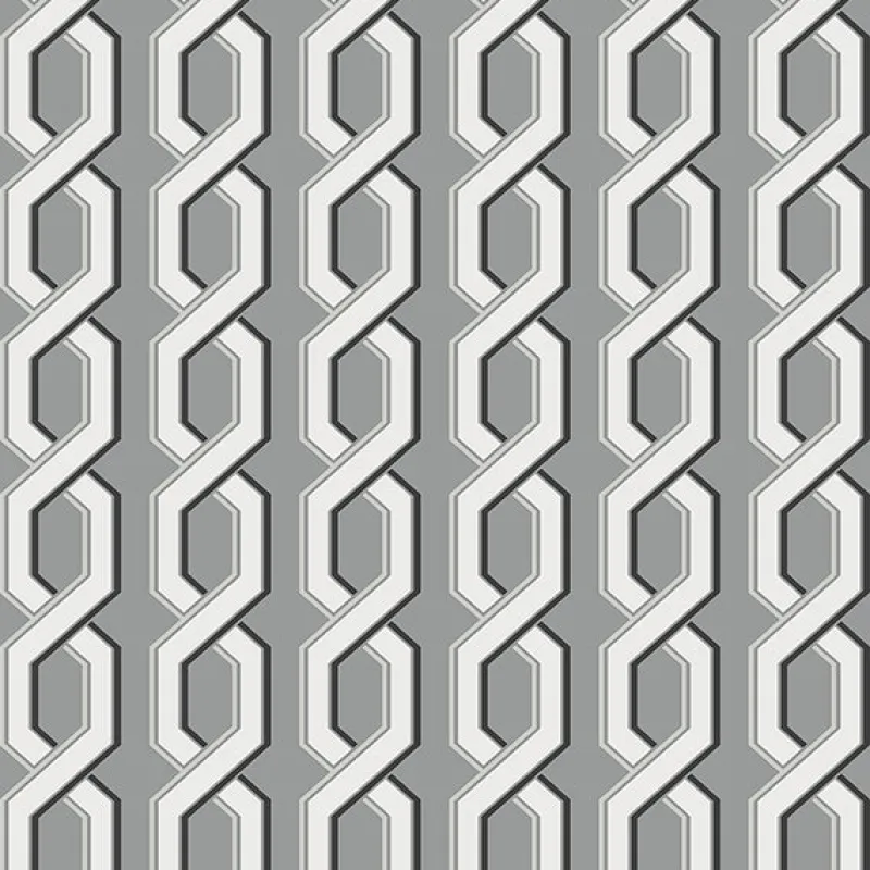 This wallpaper features a stately helix pattern. The intertwining geometric has raised ink effects and black shadows for a dimensional effect. A subtly textured grey background adds further interest to the neutral tones.