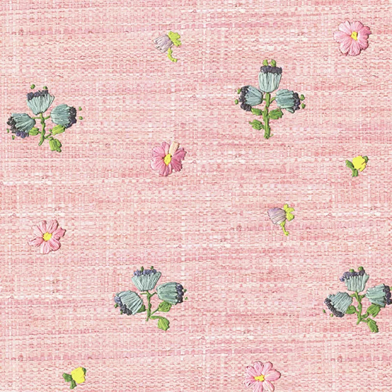 Woven raffia is given an update in a shade of vintage pink and blown-up scale. Pretty flower embroidery dot the woven look pattern with happy pops of color.