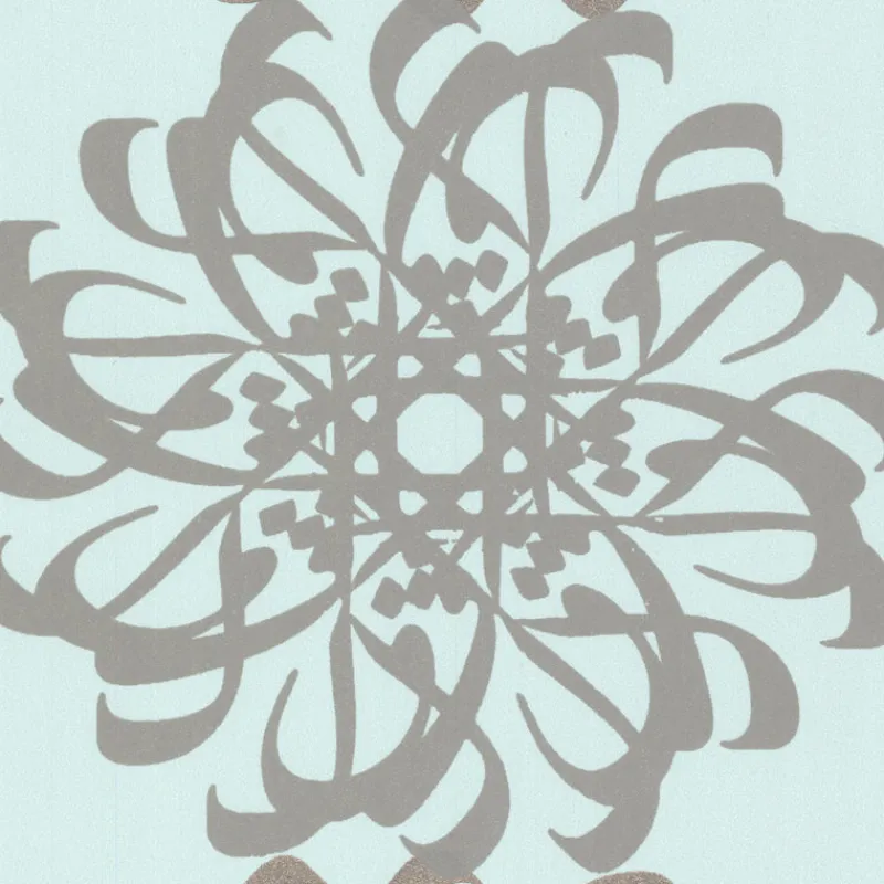 Metallic ink and suede accents add depth and intrigue to this contemporary geometric medallion, like an abstract mehndi print. The design cultivates a modern Arabic sophistication, with a luxe printing techniques and a fresh mint and silver palette.