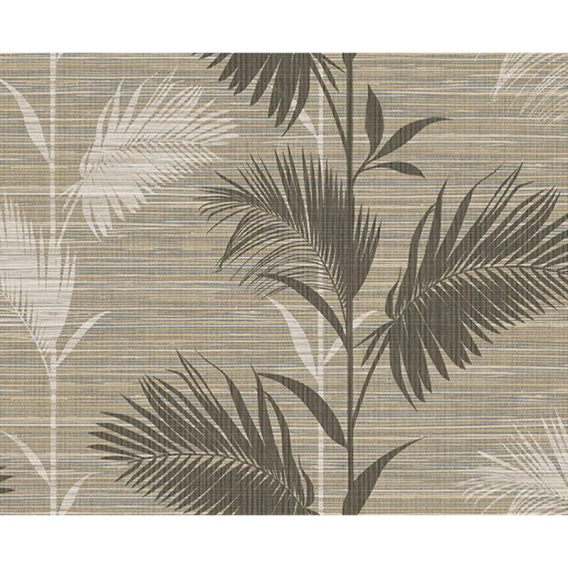 Dark grey and cream colored palm leaves are printed on striped tan and brown grasscloth in this naturally textured wallpaper.