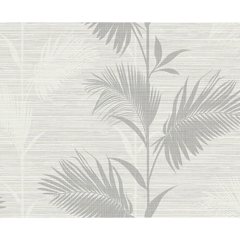 Dark grey and white palm leaves are printed on striped grey grasscloth in this naturally textured wallpaper.