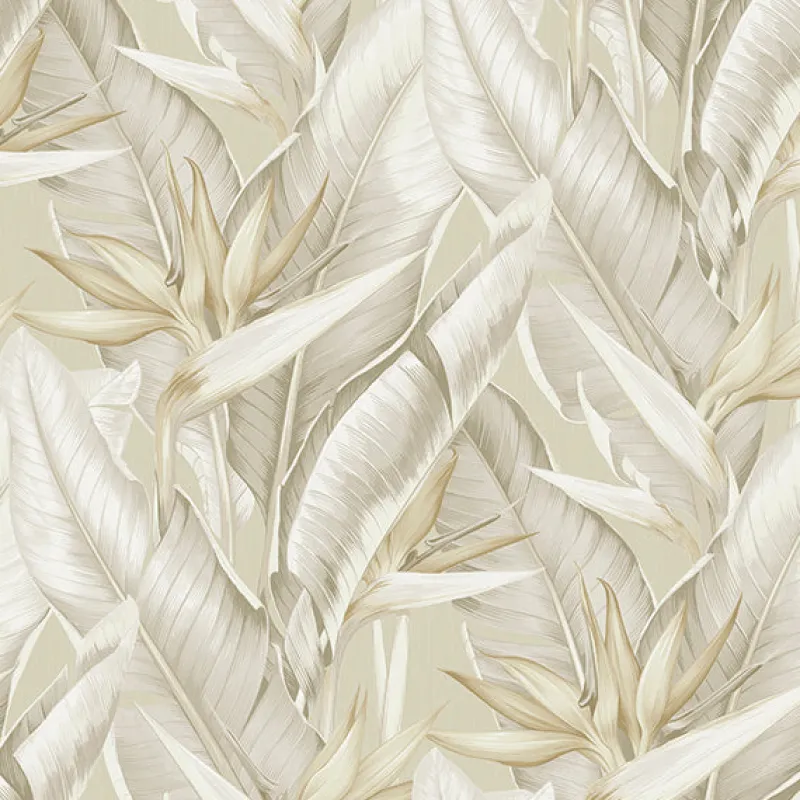 Creamy taupe leaves sprawl out and overlap in this subtly shimmering neutral wallpaper.