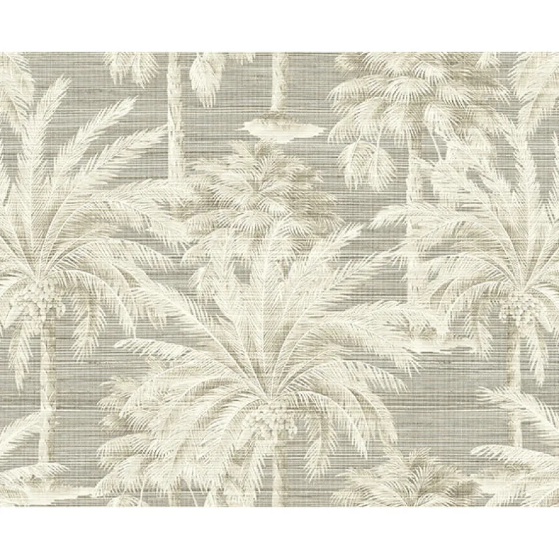 Grey palm trees scale this neutral grey grasscloth for a pretty monochromatic wallpaper.