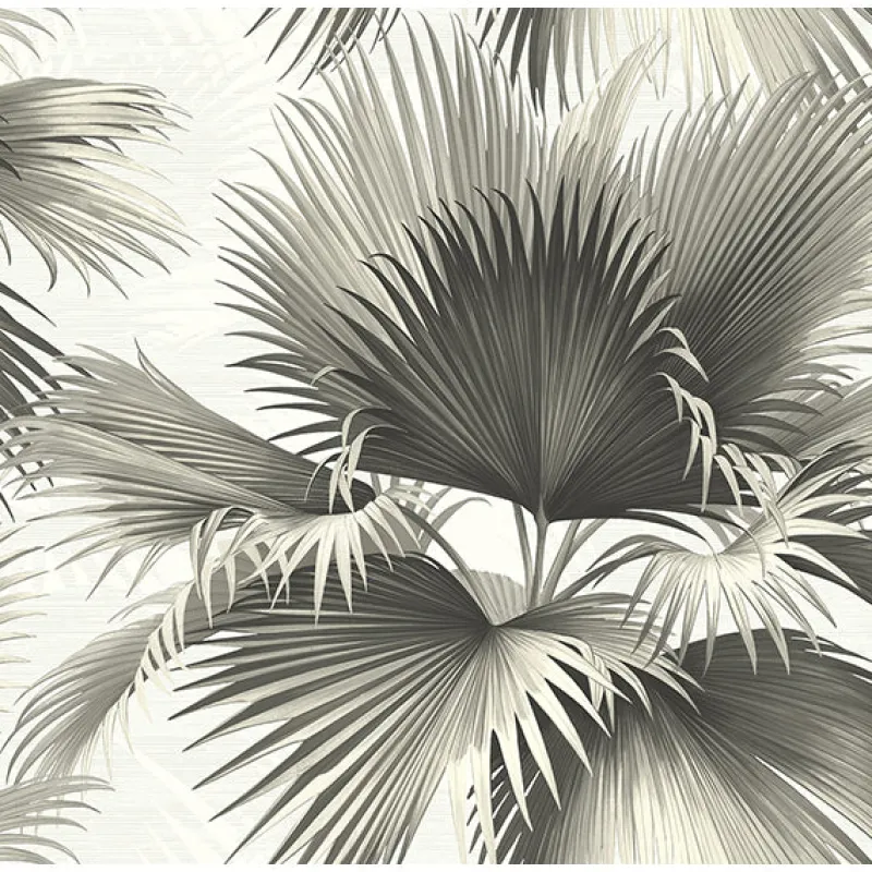Silvery grey and black palm leaves fan out in natural half circles all over this neutral greyscale wallpaper.