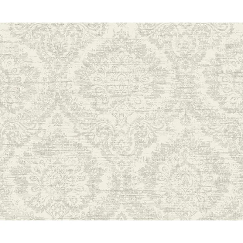 Intricate damasks stamp in this pretty neutral light grey wallpaper.