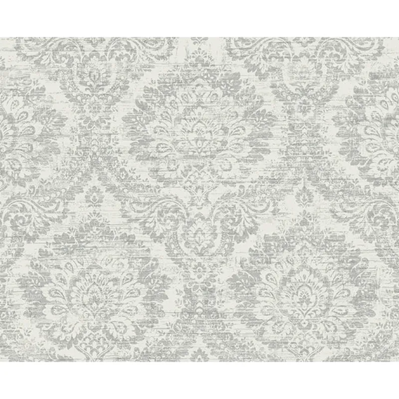 Intricate damasks stamp in this pretty neutral light blueish grey wallpaper.